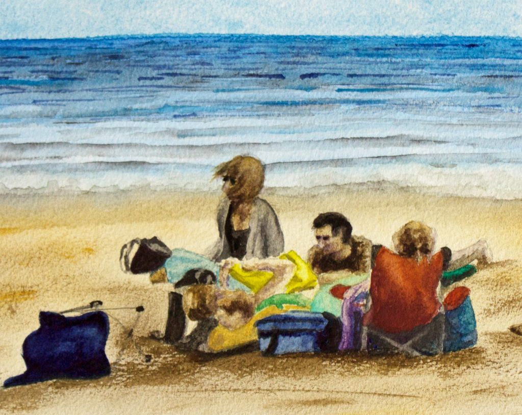 The beach scene in figure 2 is a detail from an abandoned watercolour painting and is a good example of getting it wrong and creating unconvincing figures. It shows a family on a wind-swept beach; an over turned deck chair and the woman’s hair provide movement, the posture of the figures is what you would expect from a family trying to shelter from the wind, but there is something visually that is not quite right. The woman and man are the focal point and this was true for the whole painting, because the figures look un-natural and stick out. It is not just a matter of making sure that the subtle nuances of the human form are accurately depicted (and so avoiding distorted or wooden figures), too much defined detail can also have an impact too, as in the case of this painting. My opinion as to why this grouping did not work is because the man’s face and the woman’s sunglasses are too well defined.