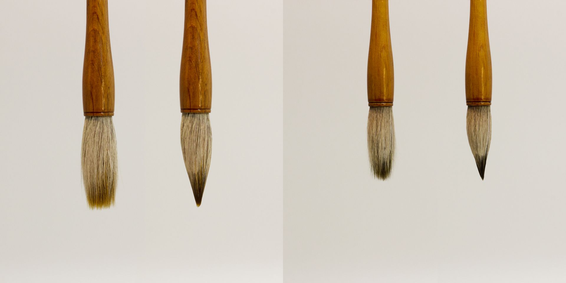 Figure 2: Large calligraphy brushes made from (a) pure black rabbit hair and (b) a combination of yellow weasel hair surrounded by white goat hair.