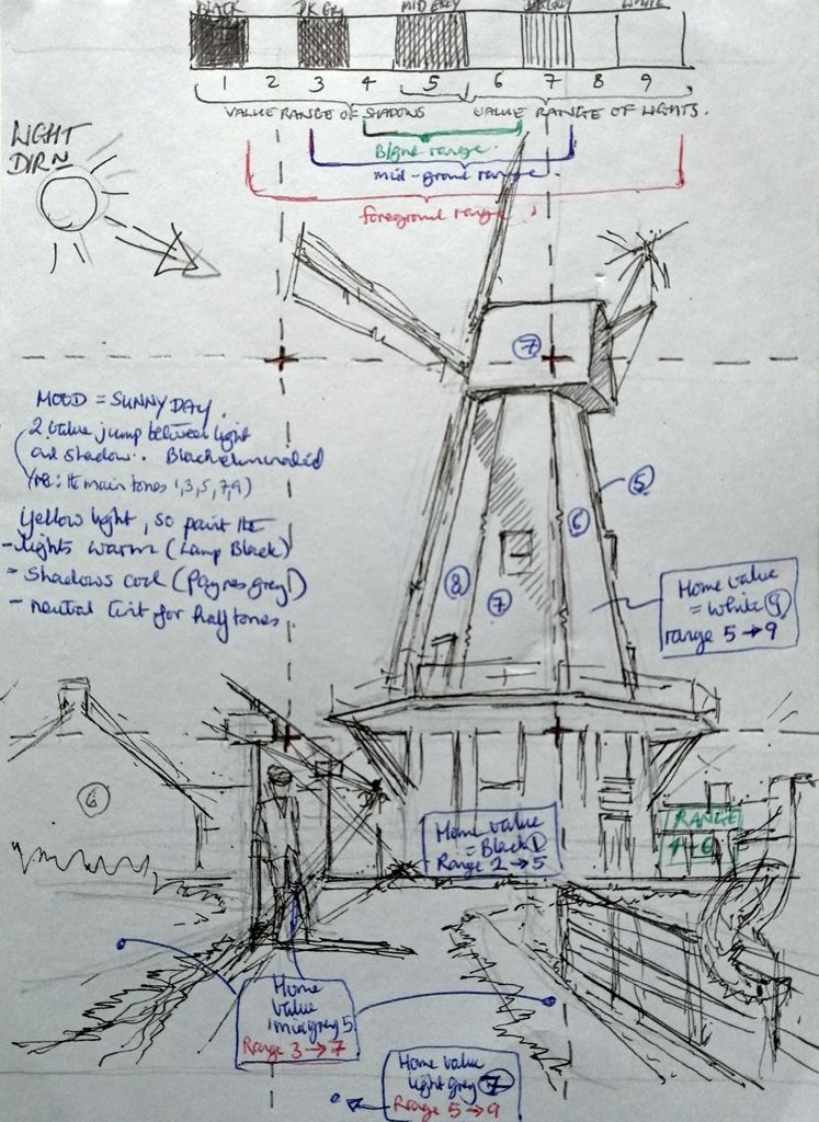 - Establish the “home values” of the main objects in the scene, i.e. the relative lightness or darkness of each object overall. It can be helpful to squint at the scene, or to take a photograph on one`s phone and convert it to black and white, in order to judge the home values. To give a couple of examples, when the scene has a mood of direct sunlight then an object that is moderately light would probably have a home value equivalent to light-grey, with shadows and lights on the object set at mid-grey and white, respectively. An object that is quite dark would probably have a home value of dark grey, with shadows and lights on the object set at black and mid-grey.