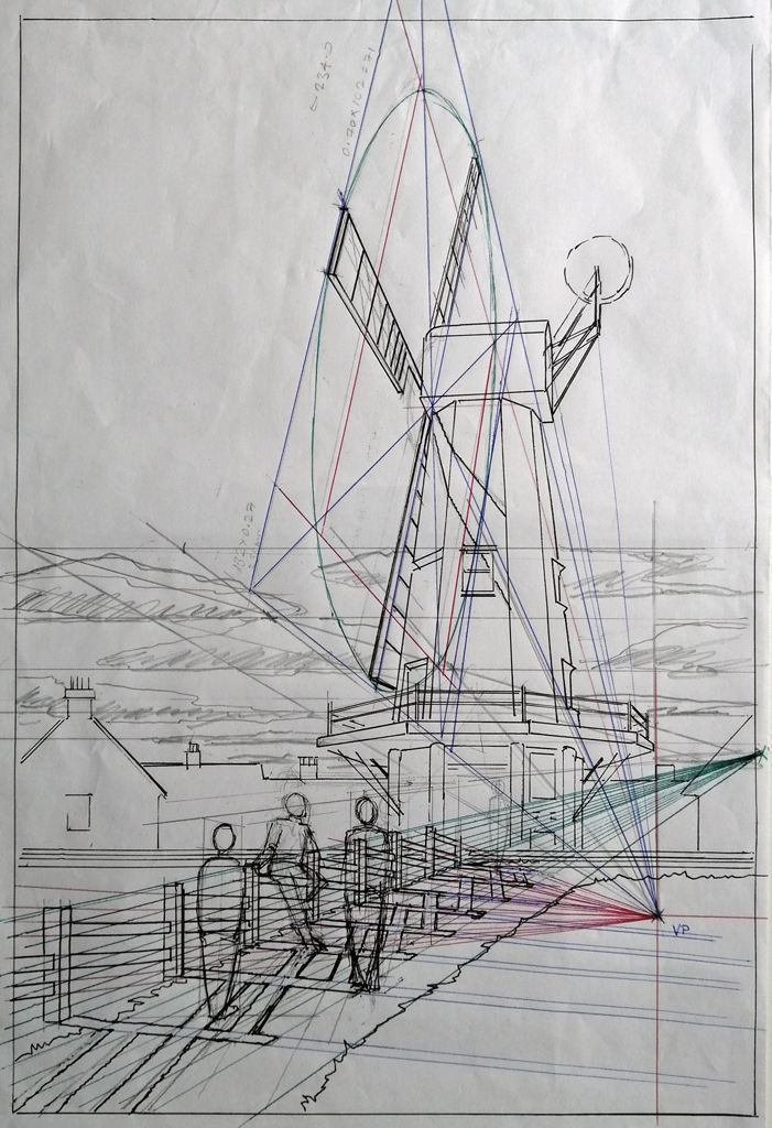 - Use linear perspective to create a sense of distance and scale using straightforward drawing rules to depict: objects getting smaller and converging the further away they are; nearer objects overlapping objects behind them; and (generally speaking) nearer objects being lower down in the picture than distant objects. When these perspective rules are understood and applied properly, the realism and sense of drama is lifted to another level. My favourite reference on the subject is The Graphic Novelist`s Guide to Drawing Perspective by Dan Cooney, publ. Search Press 2019. Figure 3 shows how I established the perspective in this scene. This particular example, with an inclined ellipse for the windmill sails and a foreground fence ascending a hill, needed a rather more detailed drawing than would most scenes.