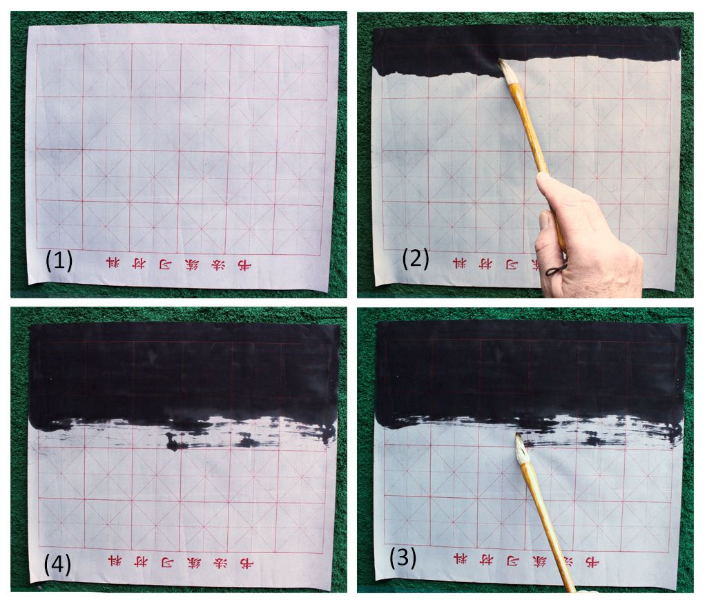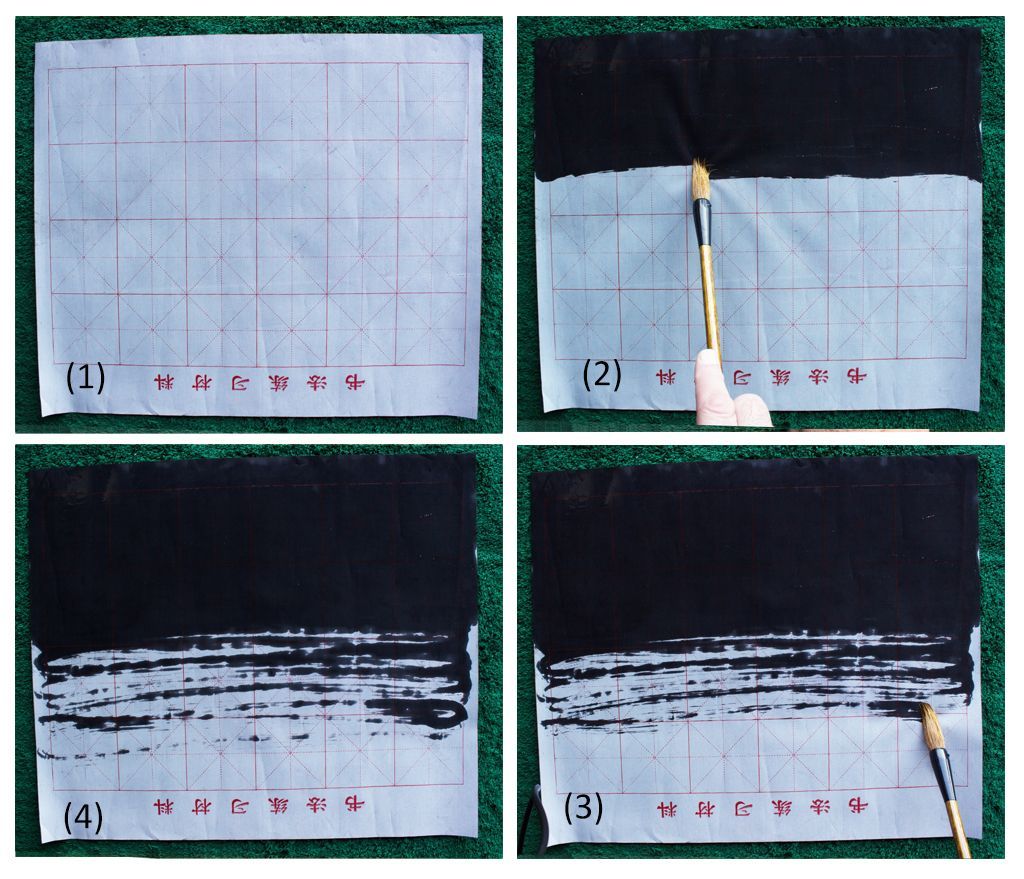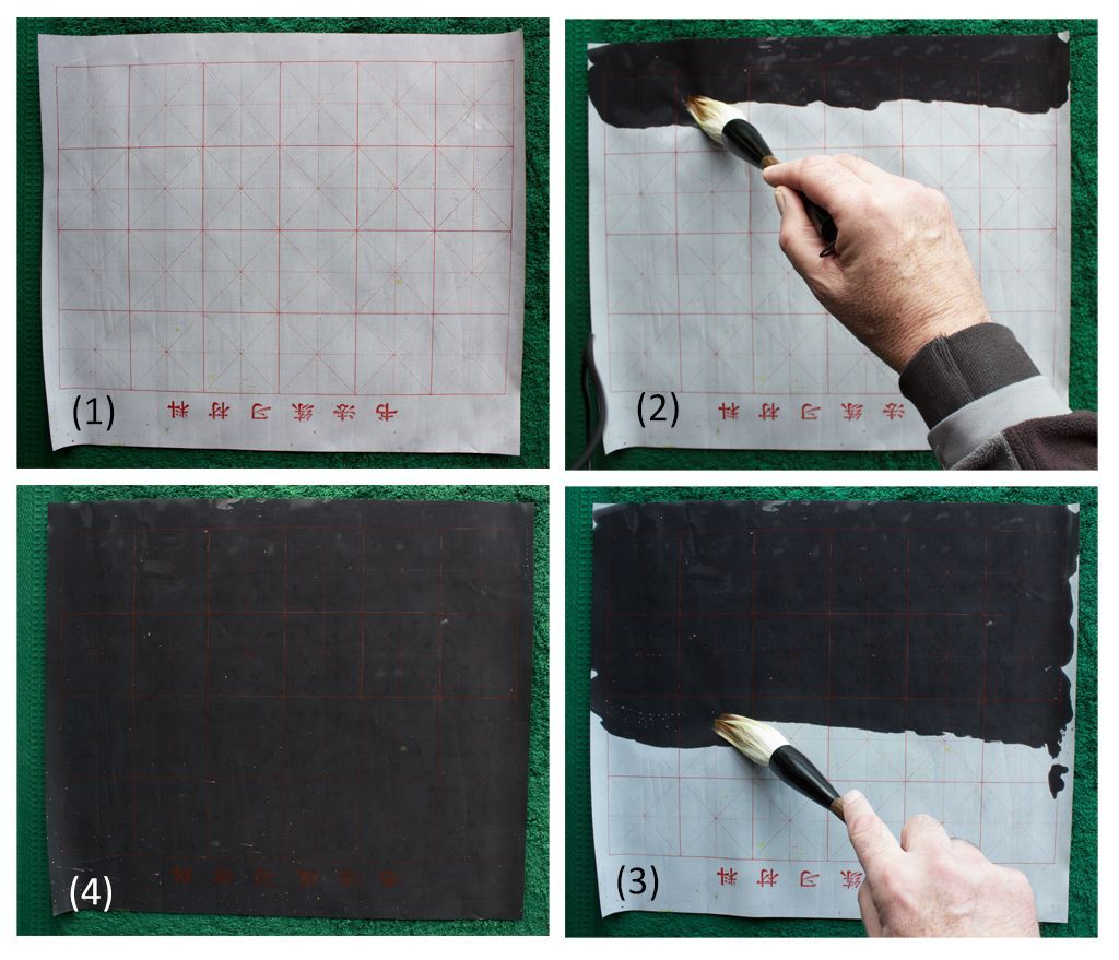 Figure 1: Painting out using a large calligraphy brush made from a combination of yellow weasel hair surrounded by white goat hair; the process follows from (1) clean dry practice cloth, to (4) completely covered.