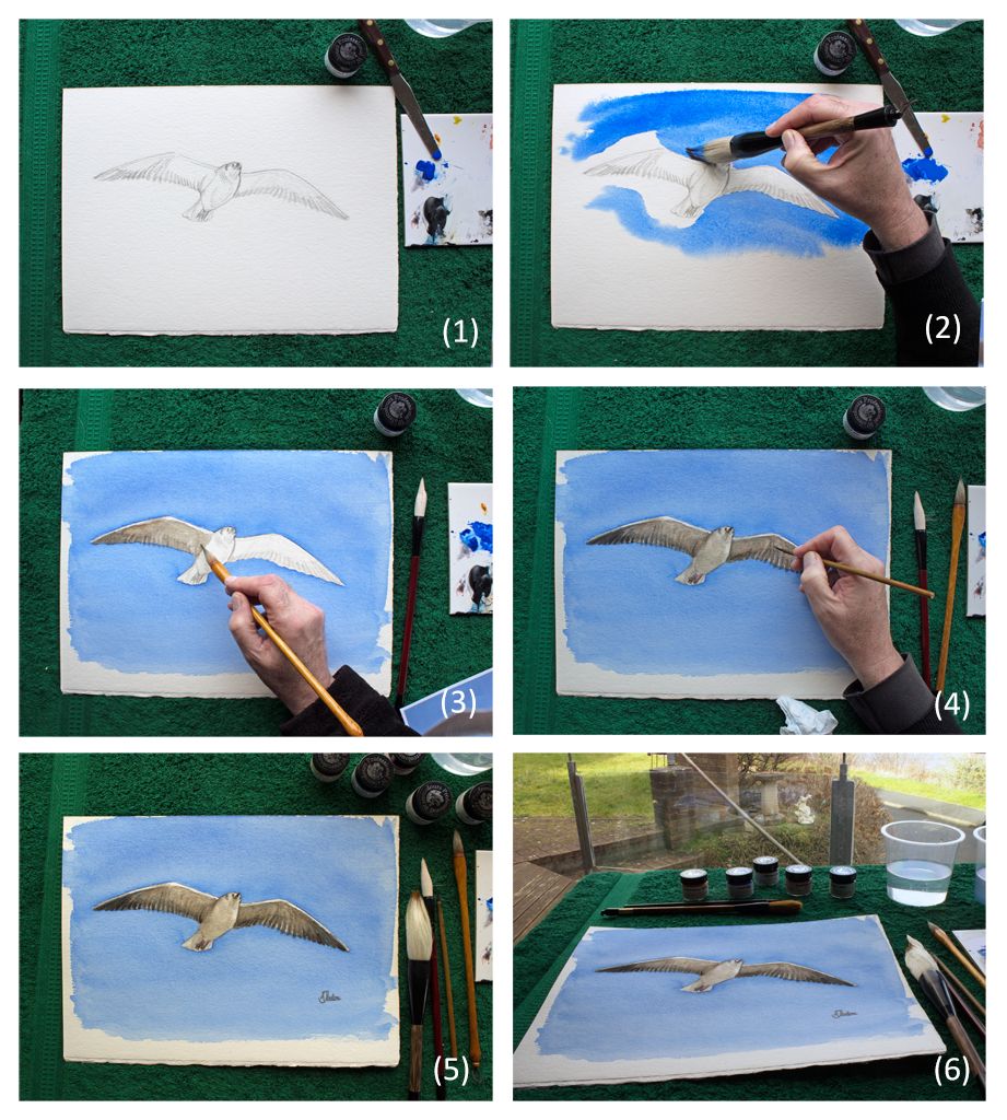 To further test these Chinese brushes, I decided to use some of them to paint with my watercolours (A J Ludlow Professional Watercolours) on hand-made watercolour paper (see figure 9). I used the different brushes for different parts of the painting; the mixed hair large calligraphy brush for the background wash (figure 9(2)), the medium mixed hair brush for the bulk of the painting of the seagull (figure 9(3)) and the short-haired detailing brush to add in the final details (figure 9(4)).