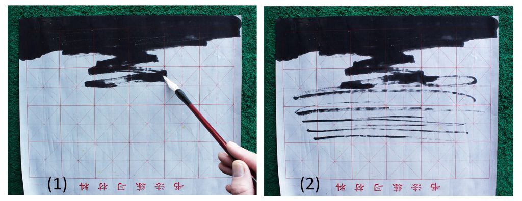 The results obtained using the large calligraphy brushes (figure 1 and 2), show complete coverage of the practice cloth (approximately equivalent to a flat wash over an area larger than A3) in a single stroke. After painting out, the mixed hair brush still contained a lot of water, whereas the rabbit hair brush was reaching its limit.
