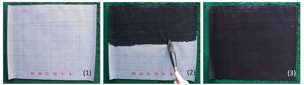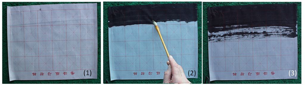 Figure 2: Painting out using a large calligraphy brush made from pure black rabbit hair; the process follows from (1) clean dry practice cloth, to (3) completely covered.
