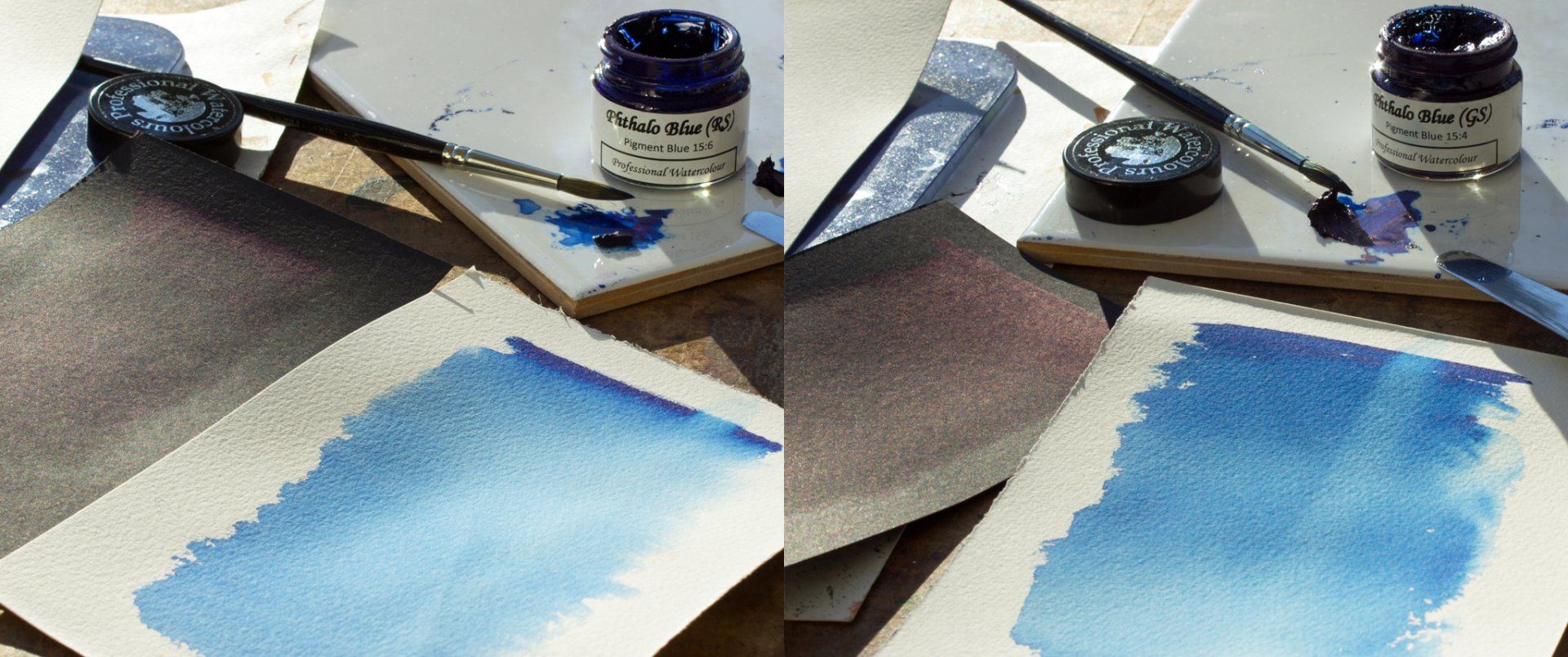 Copper phthalocyanine exhibits polymorphism (existing in different crystal forms), the three commercially important ones are alpha (α), beta (β) and epsilon (ε); traditionally, red shade phthalocyanine blues were prepared from α-copper phthalocyanine (C.I. PB15:1 and C.I. PB15:2), whilst green shade ones from the β-form (C.I. PB15:3 and C.I. PB15:4). The ε-form is redder in shade, more stable and has a higher tinting strength than α-copper phthalocyanine, making this pigment the best choice for a red shade phthalocyanine blue in my professional watercolour range.