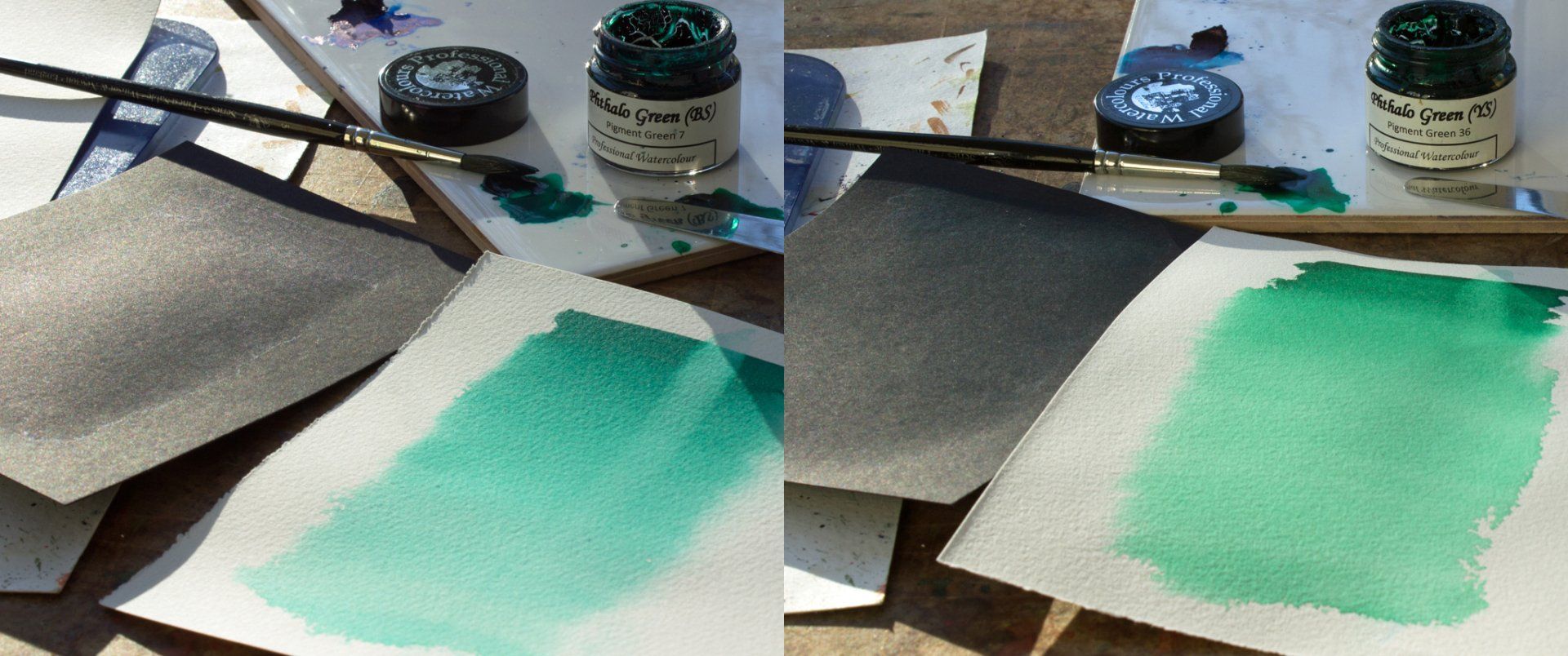 This pigment, like the copper phthalocyanines are classed as organic pigments and as so, tend to have relatively smaller particle sizes and larger surface areas than inorganic pigments, giving them a tendency to have higher tinctorial strengths (the strength of the colour increases with decreasing particle size) and be more transparent (as the smaller particle size scatters less light), which can affect the cleanness of the resulting watercolour’s ability to “lift-out” and so watercolours based on organic pigments have a greater tendency to stain (as can be seen in figures 2, 3 and 4).