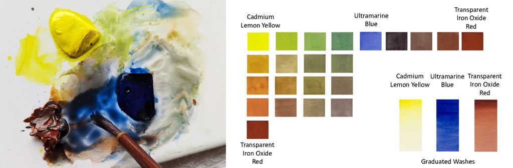 Our “All you need to paint..” sets have a very large creative element and the pencil-line drawings, instructions and even the video are only there for guidance and support. The various colours required to turn the 2D imagery into a 3D painting require mixing from the three supplied watercolours, introducing the basics of colour-mixing (figure 1), which is an essential skill that every artist needs to develop.