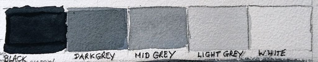 - Establish the “home values” of the main objects in the scene, i.e. the relative lightness or darkness of each object overall. It can be helpful to squint at the scene, or to take a photograph on one`s phone and convert it to black and white, in order to judge the home values. To give a couple of examples, when the scene has a mood of direct sunlight then an object that is moderately light would probably have a home value equivalent to light-grey, with shadows and lights on the object set at mid-grey and white, respectively. An object that is quite dark would probably have a home value of dark grey, with shadows and lights on the object set at black and mid-grey.