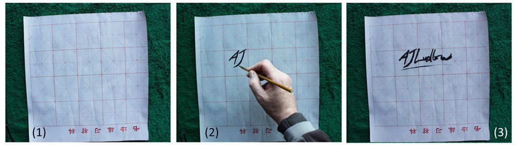 Figure 2: Painting out using a large calligraphy brush made from pure black rabbit hair; the process follows from (1) clean dry practice cloth, to (3) completely covered.