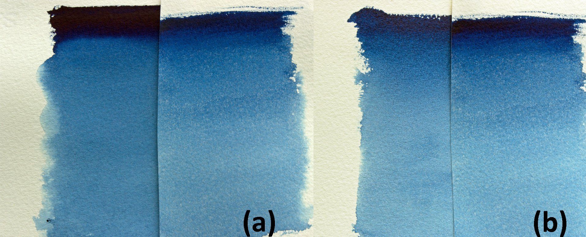Figure 4: Prussian and Antwerp blues: (a) comparison of graduated washes and (b) tinctorial strength (10 white : 1 colour).