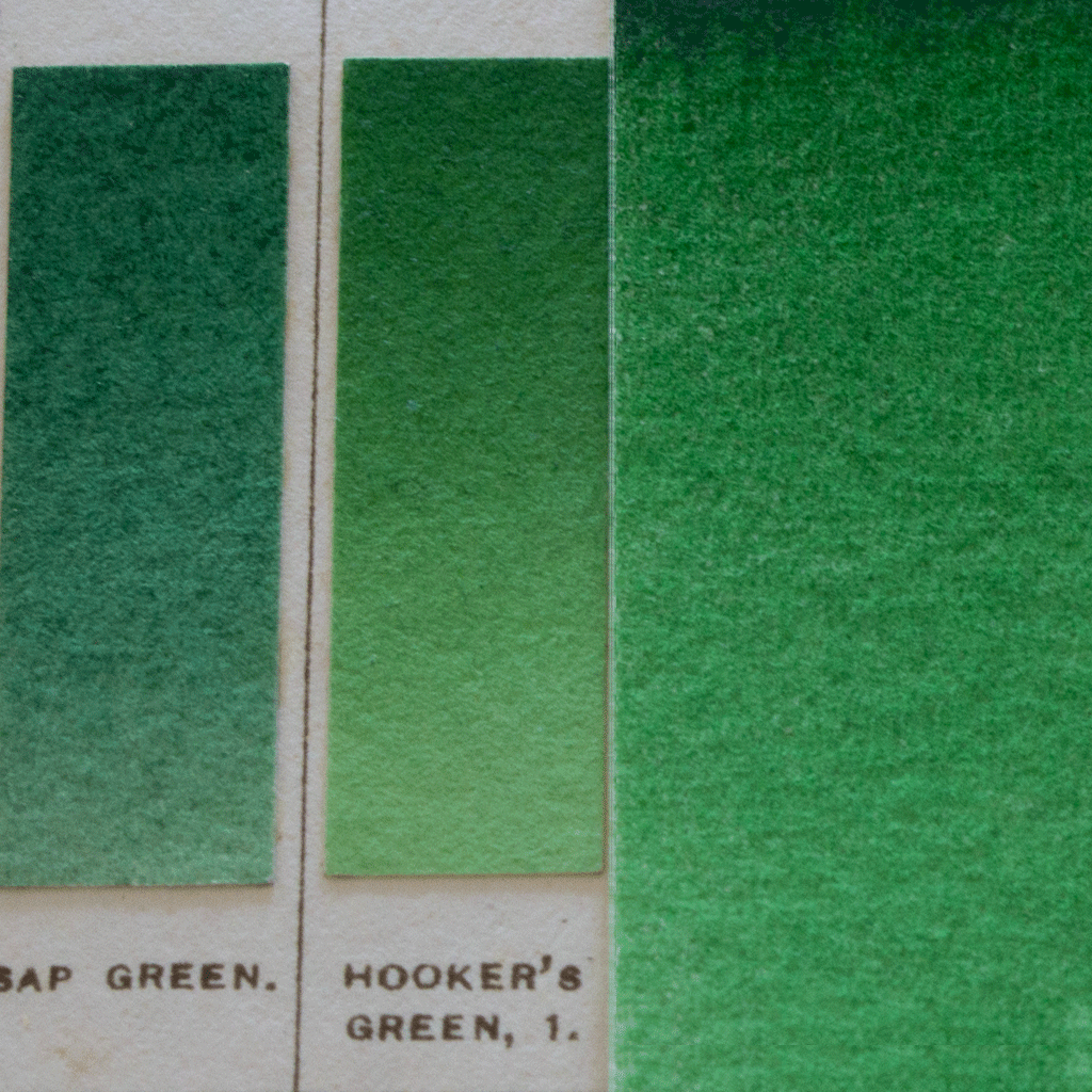 Attention to detail in matching this watercolour's hue to the traditional Hooker's Green No1 as described by Salter (1869) as "a grass green, in which the yellow predominates” and detailed in “A Descriptive Handbook of Modern Water Colour Pigments” by J Scott Taylor (1887).