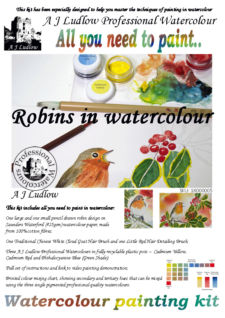 Our “All you need to paint..” watercolour painting sets do contain all that’s needed to paint the two pencil drawn Robins on Saunders Waterford 425gsm watercolour paper. By using Cadmium Yellow, Cadmium Red and Phthalocyanine Blue (Green Shade) Professional Watercolour and 2 of our finest Chinese brushes, a traditional "White Cloud" goat hair painting brush and detailing brush, both designs can be expertly painted following our individual 12-step printed painting instructions. There are also video painting demonstrations for each design available on our YouTube channel, which can be reached via dedicated QR codes. If you are a bit of a “Maverick”, then there is scope for you to include your own choice of background.