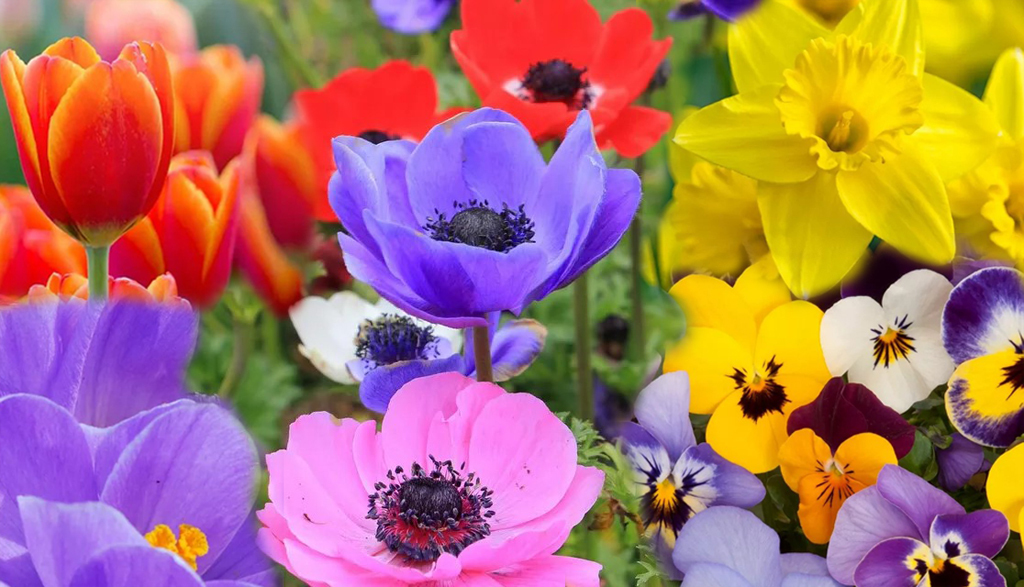 Figure 2: A photographic montage of spring flowers; (clockwise) tulips, anemones, daffodils, pansies and crocuses.