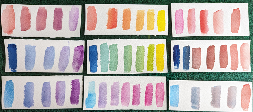 Figure 1: A selection of watercolour secondary hues that can be mixed from this 6 colour selection, showing how versatile this mini gift set is in capturing nature's springtime beauty.